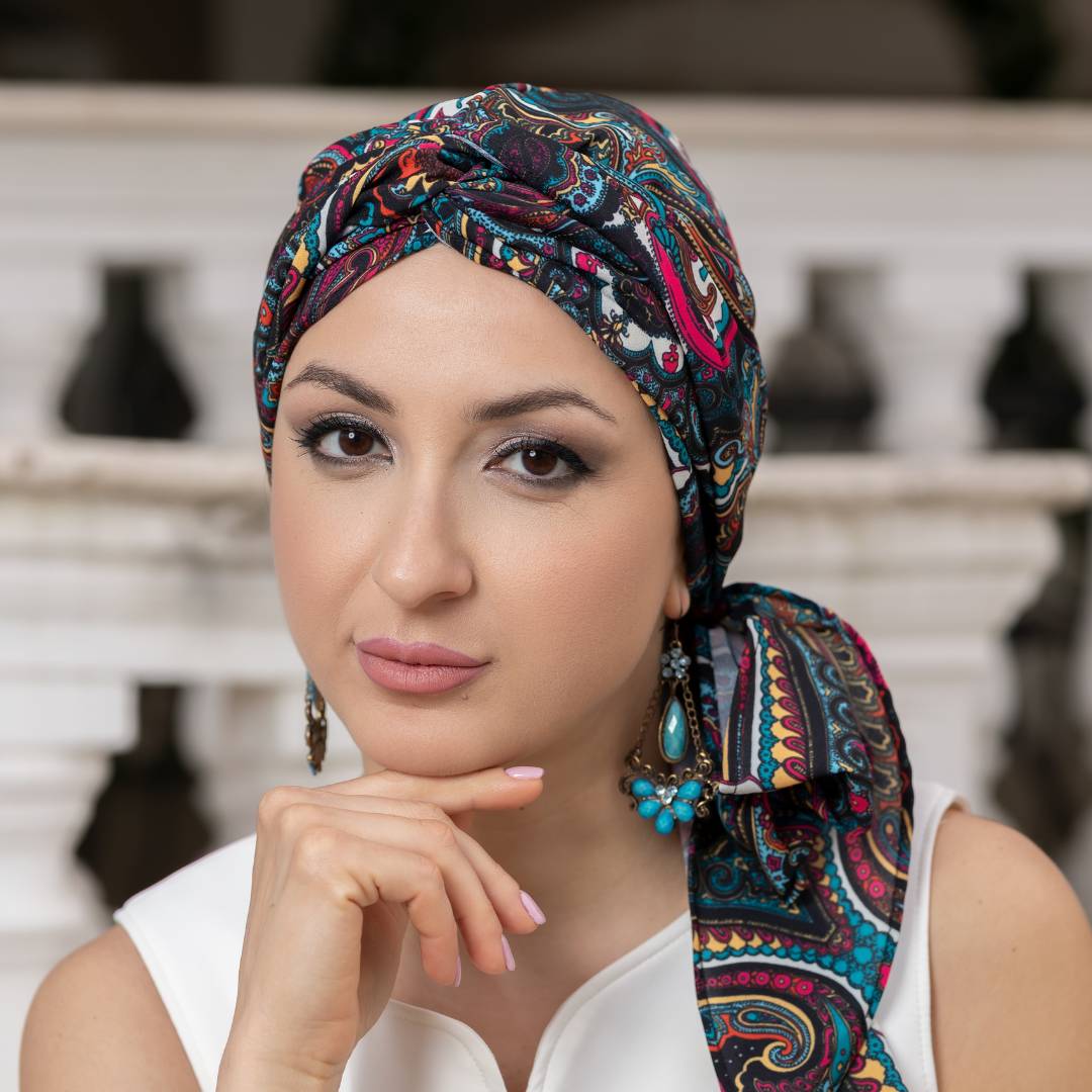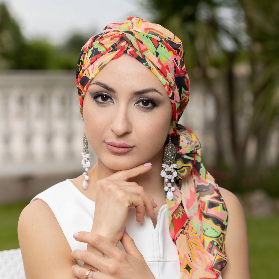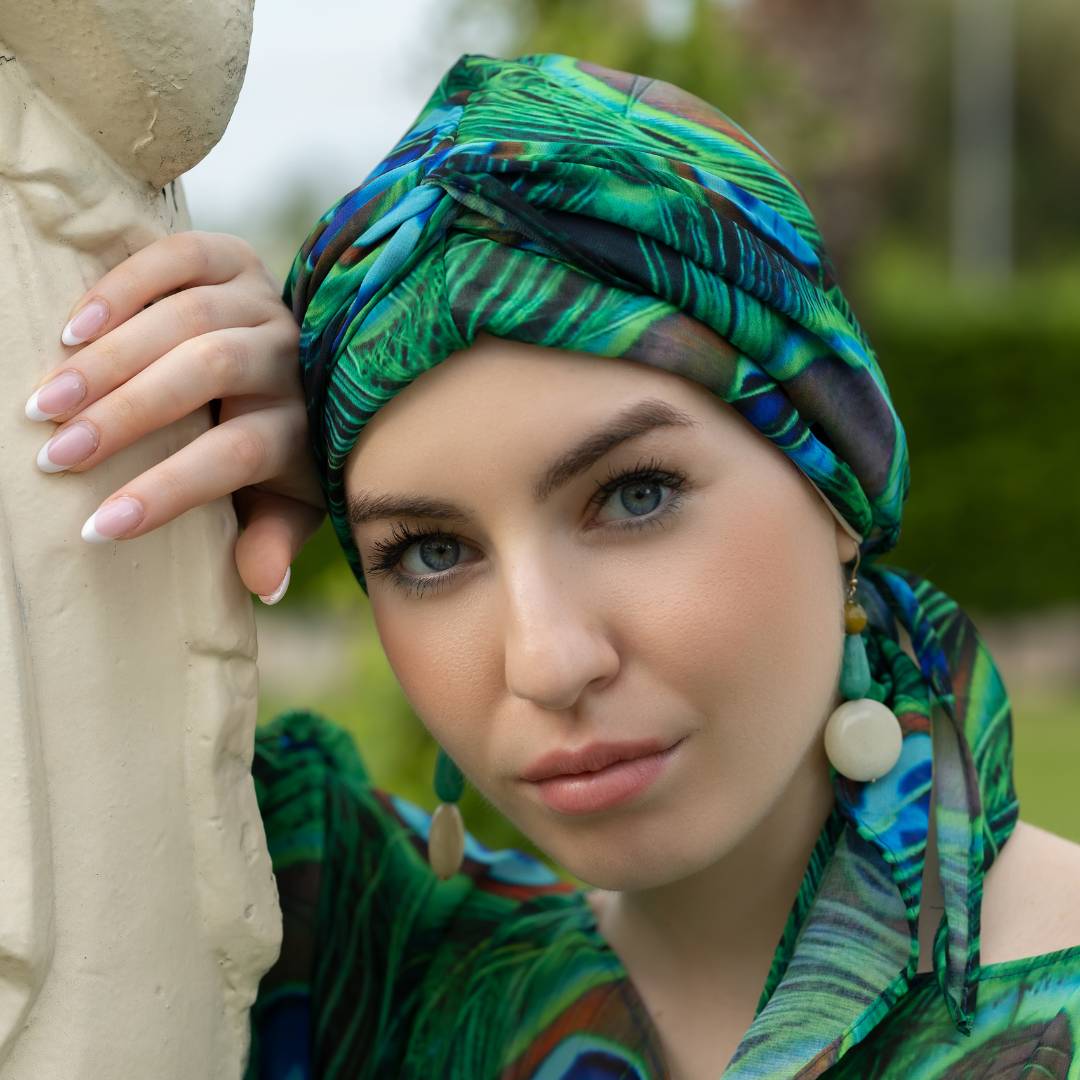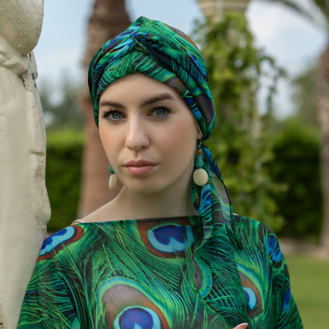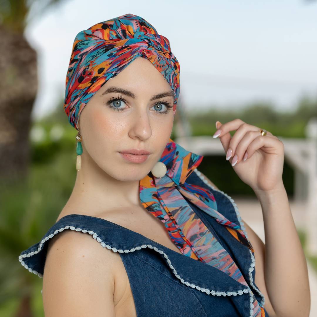 Questo turbante offre diverse varianti di vestibilità in base a come si decide di posizionarlo.