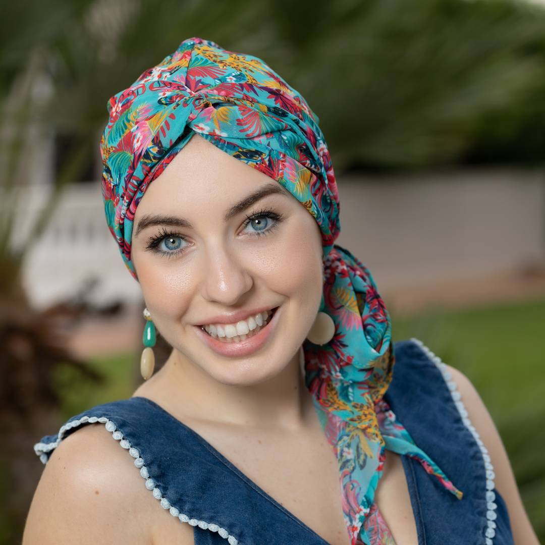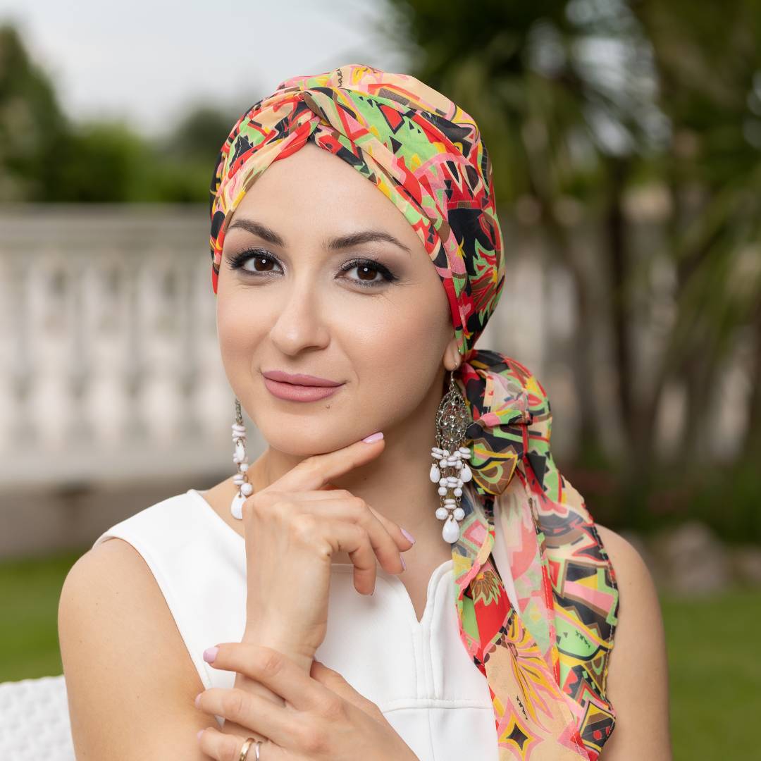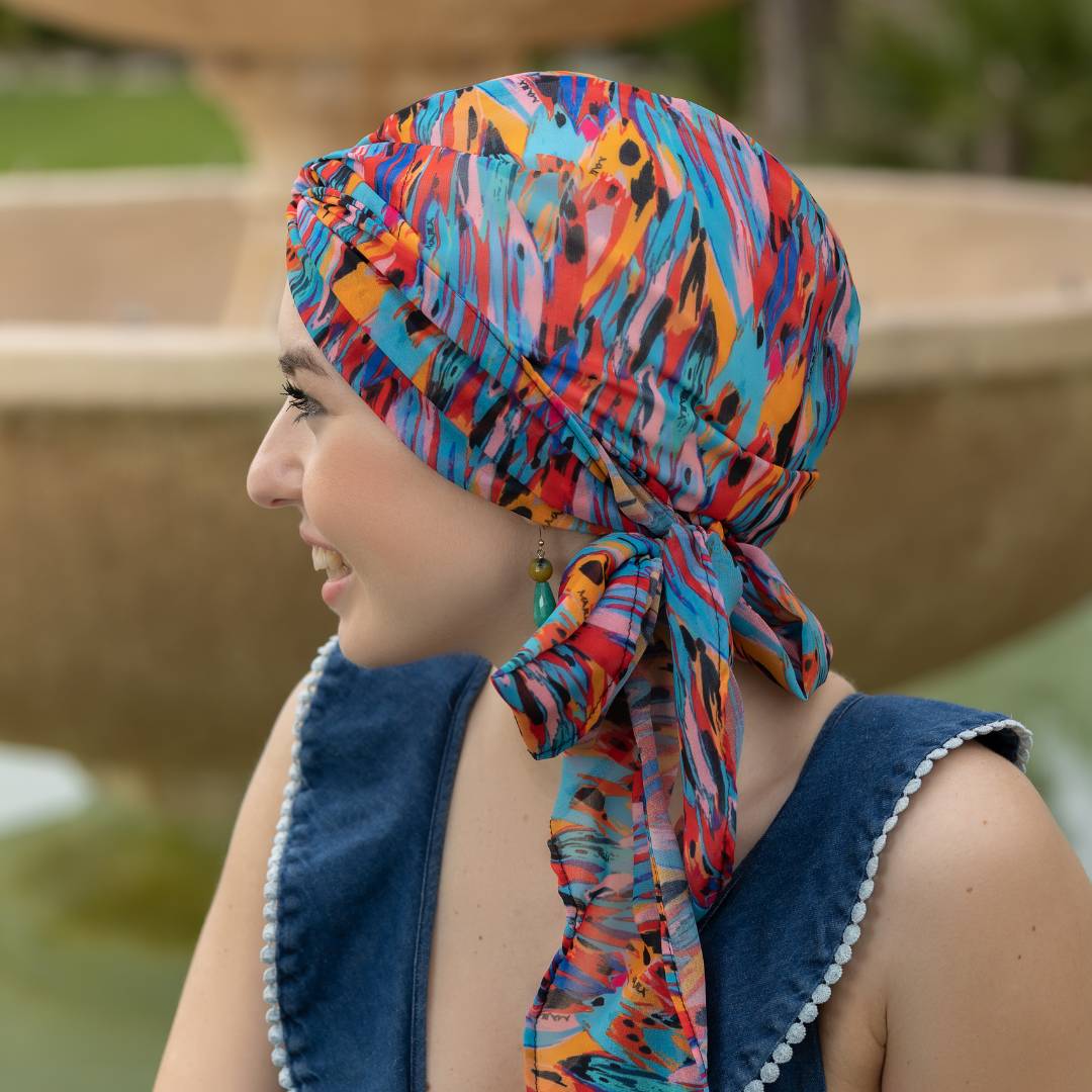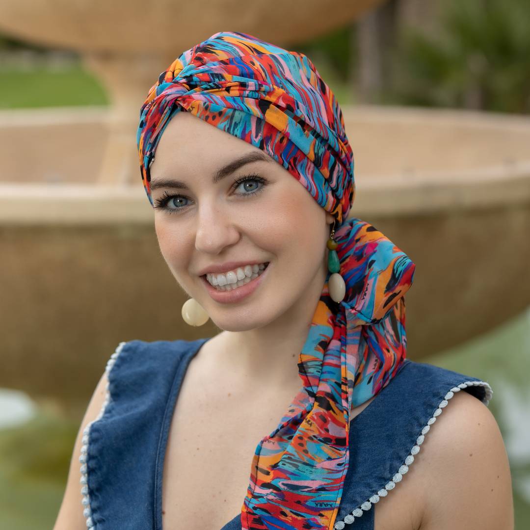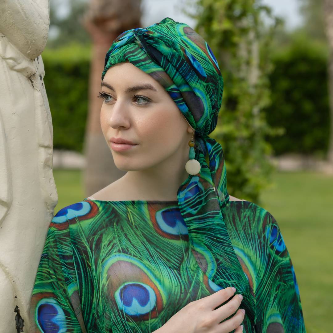 Questo turbante offre diverse varianti di vestibilità in base a come si decide di posizionarlo.
